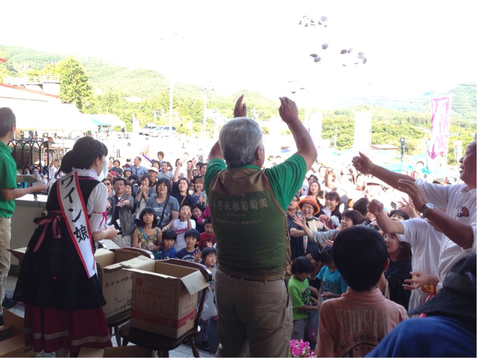 エーデルワインの社長と常務、ワイン娘がもちまきを行いました!