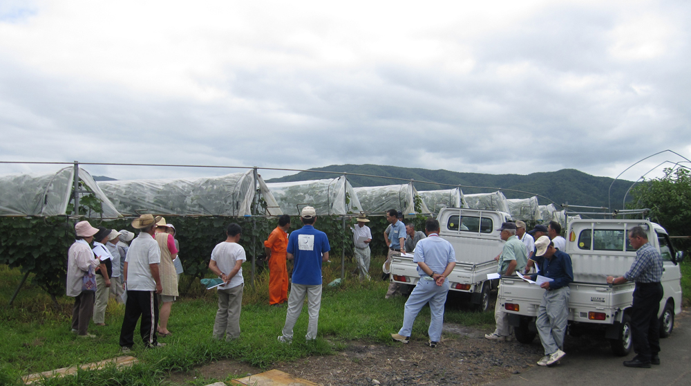 エーデルワインでは、ワイン専用品ぶどうを栽培している農家の方(39名)と「ワイン専用ぶどう栽培研究会」を組織しており、月に一回栽培指導会を開催しています。